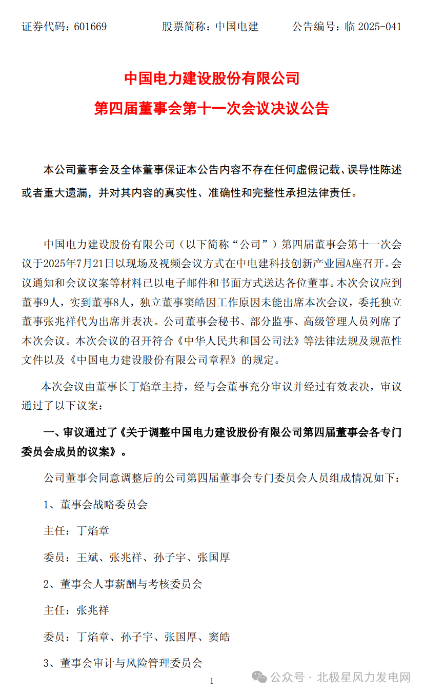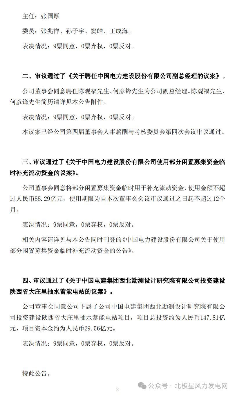 7月23日,中国电建发布《第四届董事会第十一次会议决议公告》。中国电建召开第四届董事会第十一次会议审议通过了《关于聘任中国电力建设股份有限公司副总经理的议案》,公司董事会同意聘任陈观福先生、何彦锋先生为公司副总经理。