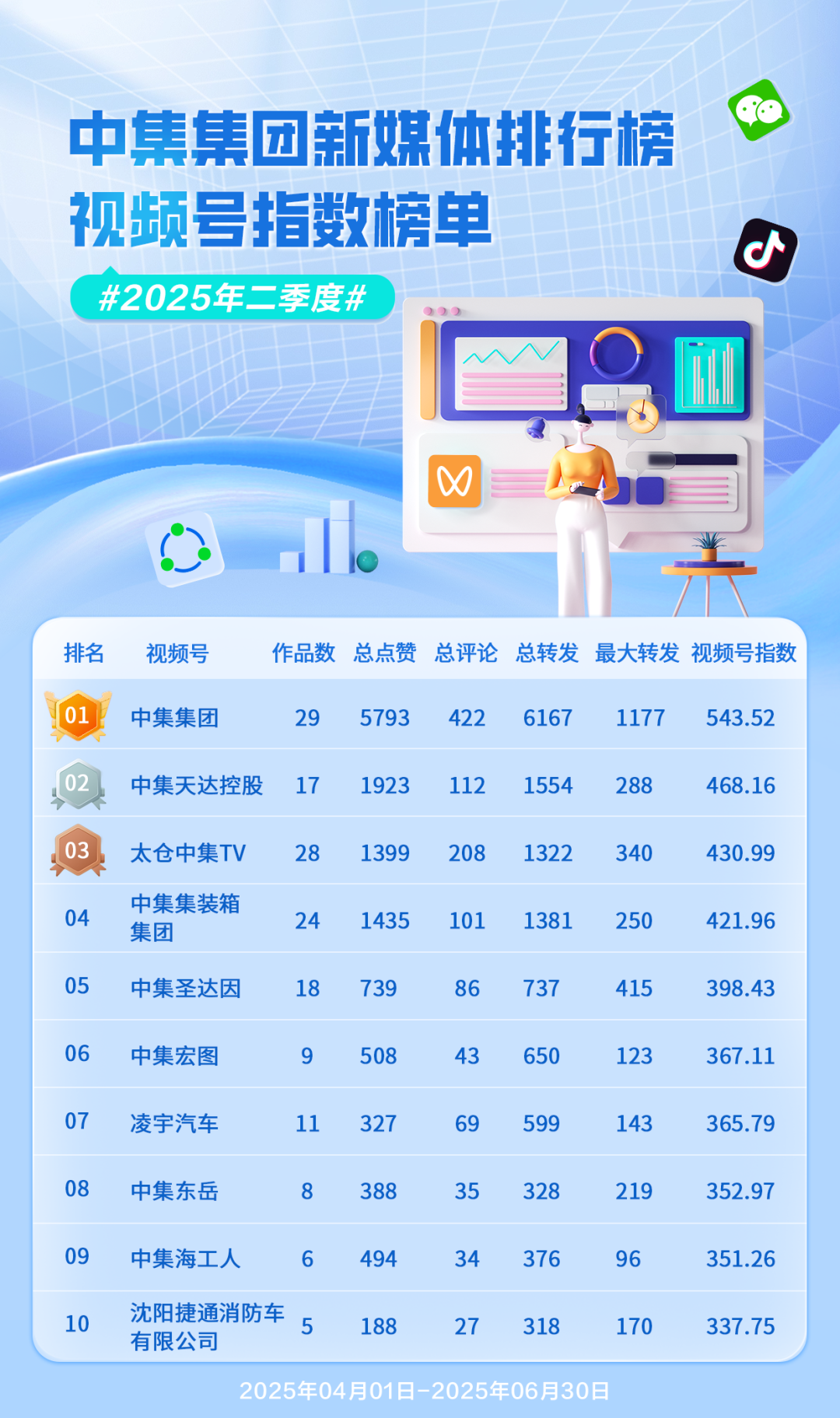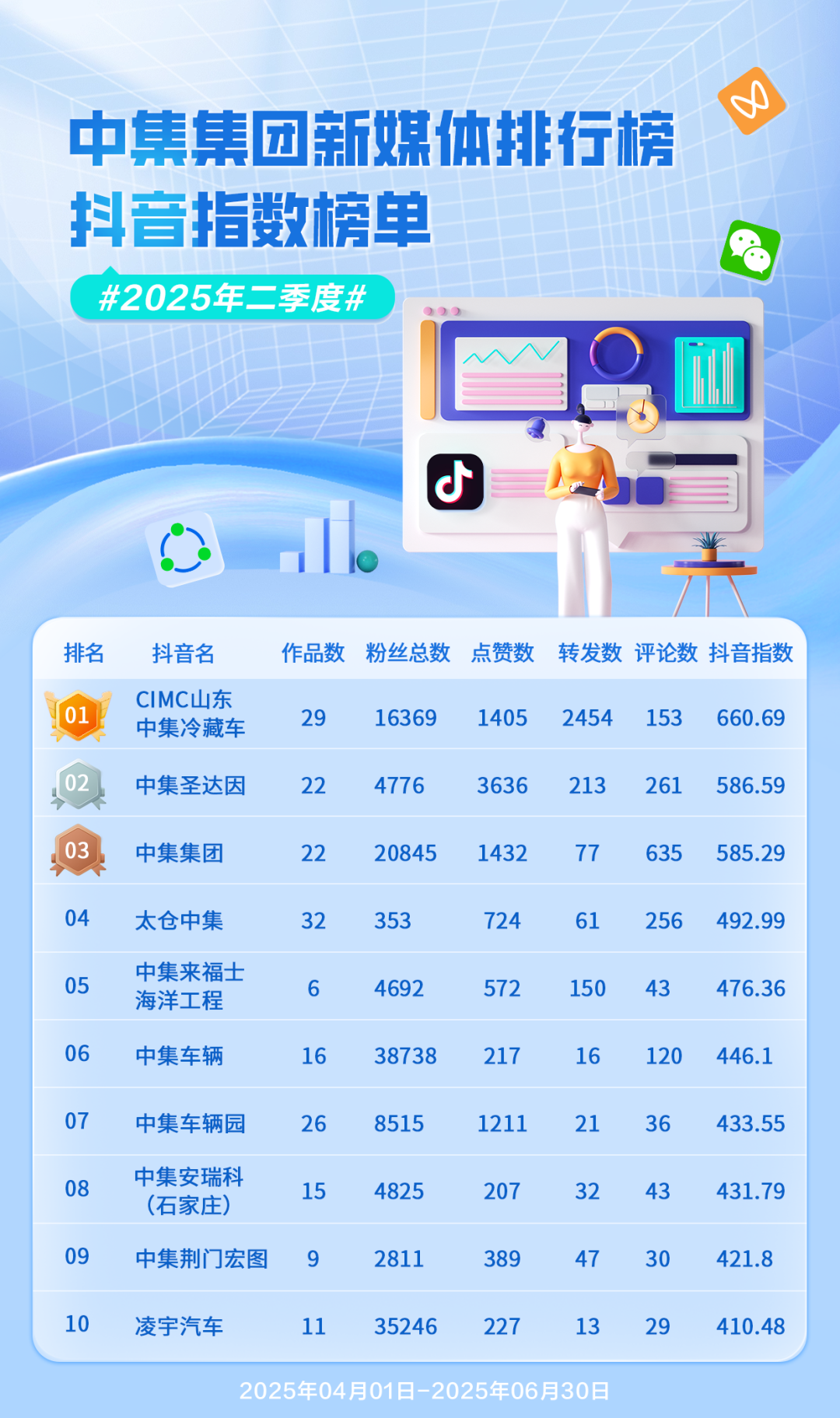 “中集集团”二季度视频号/抖音号内容影响力持续提升。其中视频号累计发布29条,总播放量超过88万,环比增长114%,同比增长313%;总点赞数环比增长159%;总推荐数环比增长141%;总评论数环比增长200%;AIGC视频成为突出亮点,延续了“有趣味、有创意”的风格,获得集团内外广泛好评;“怡探究竟”主播系列持续发力,深入业务一线场景,讲述新中集的新故事,逐渐成为集团视频号的重点栏目;此外,集团视频号还联合相关业务板块发布了多条高质量新闻类视频,强化中集品牌的专业形象与国际视野。