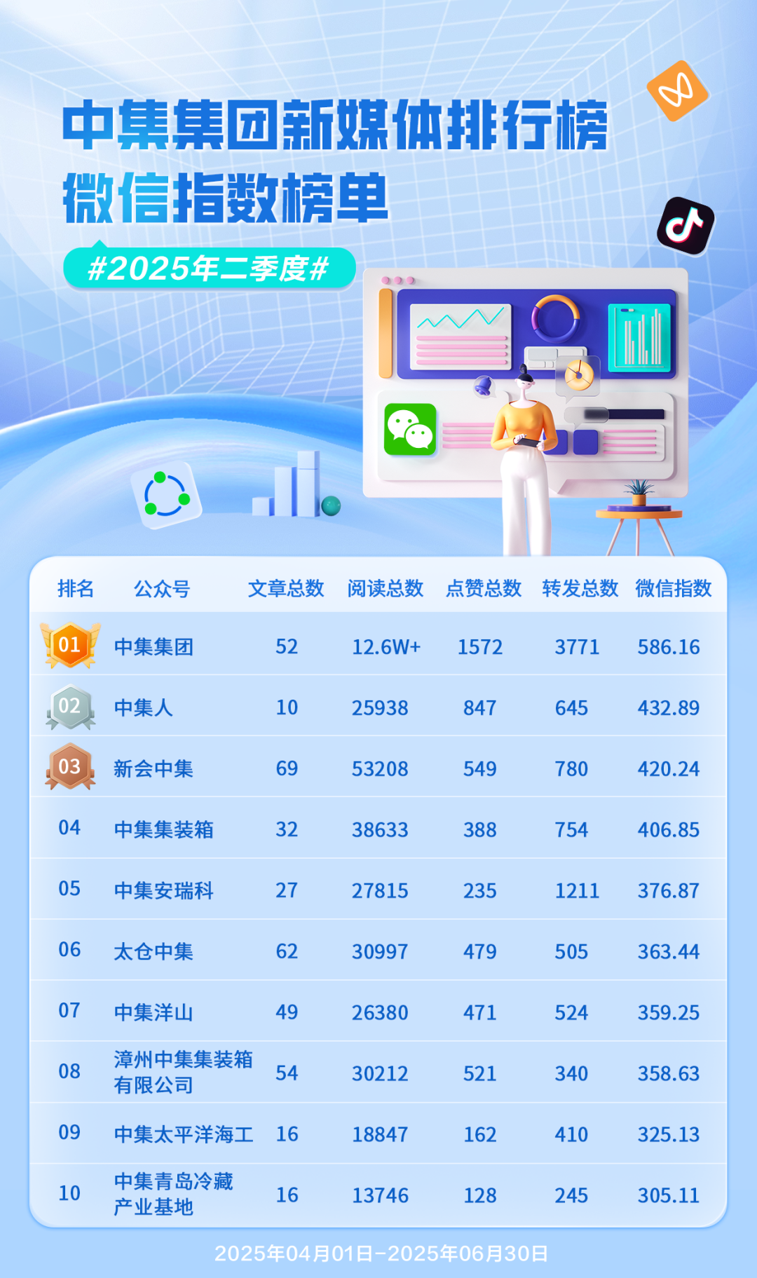 其中,中集青岛冷藏产业基地账号首次跻身微信指数TOP10,展现出强劲的品牌传播势头。新会中集账号以69篇发文量保持稳定输出,体现其持续的内容生产能力。